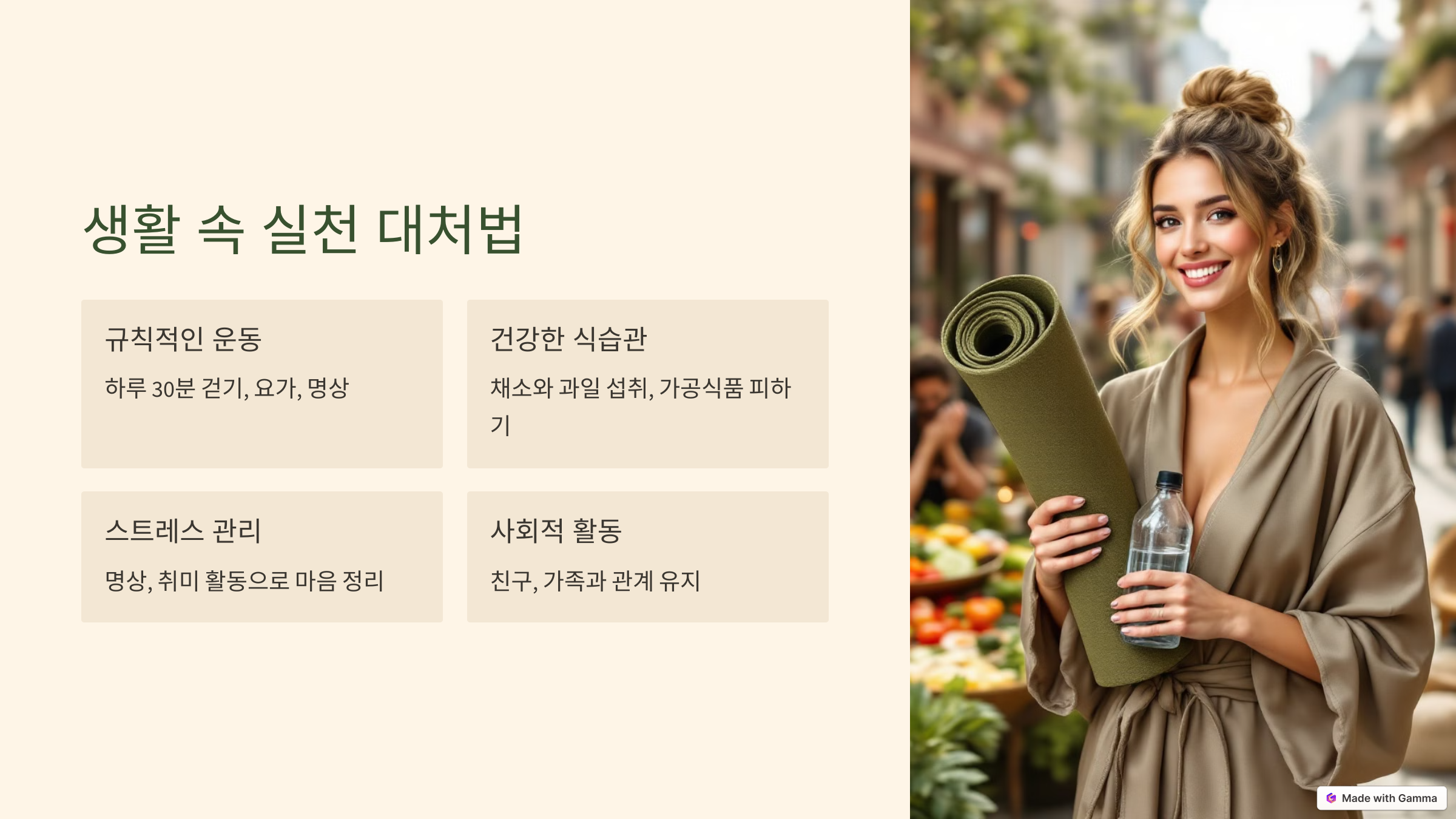 - 규칙적인 운동: 하루 30분 걷기, 요가, 명상 등을 실천해 신체와 정신을 동시에 관리하세요. 🏃♂️