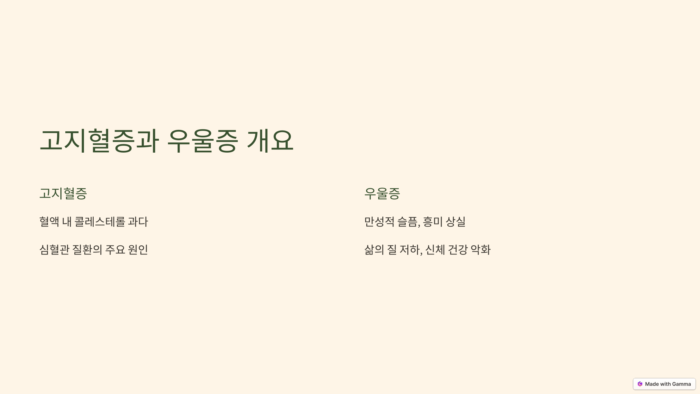 - 라이프스타일 요인: 고지혈증과 우울증은 둘 다 운동 부족, 불균형한 식습관, 흡연, 음주 등과 관련이 있습니다.