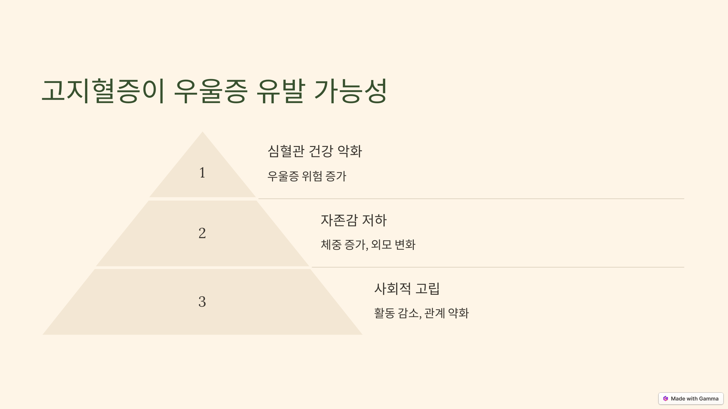 - 심혈관 건강 악화: 고지혈증으로 인해 심혈관 질환 위험이 높아지며, 이는 우울증을 유발할 수 있습니다.