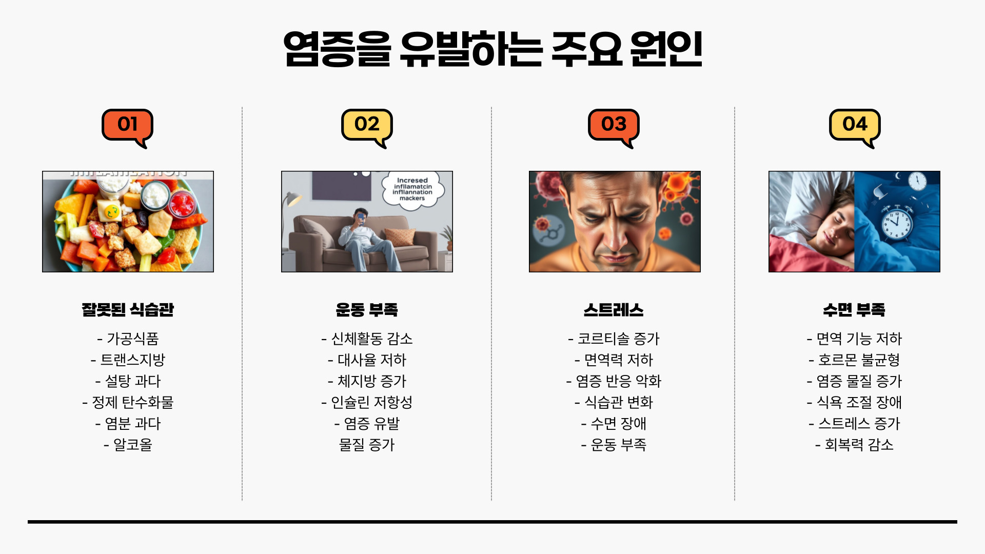 - 운동 부족: 신체 활동이 적으면 염증 반응이 더 쉽게 활성화됩니다.
