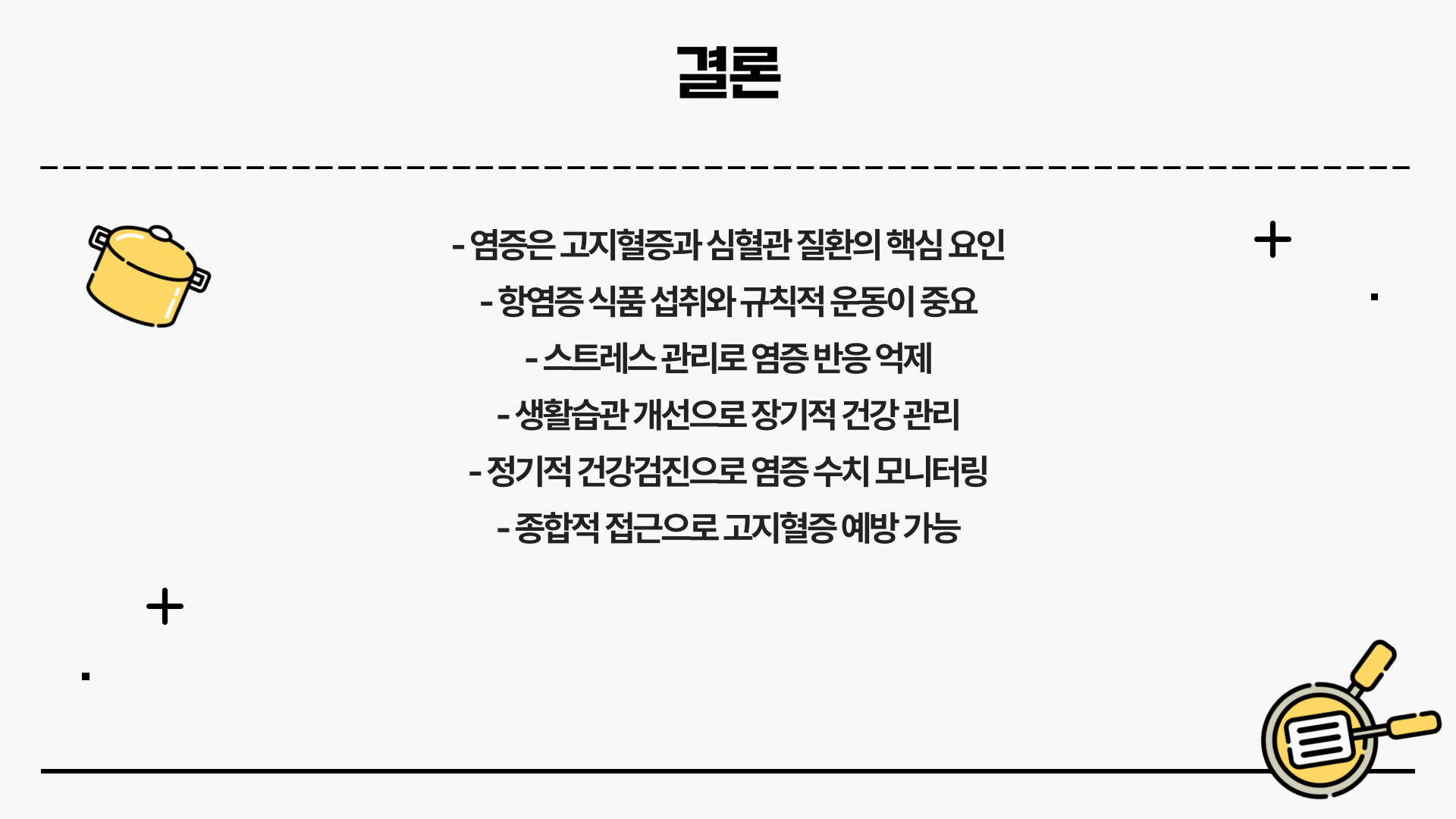 - 만성 염증은 '좋은 콜레스테롤'로 알려진 HDL의 기능을 방해해 콜레스테롤 제거 능력을 저하시킵니다.