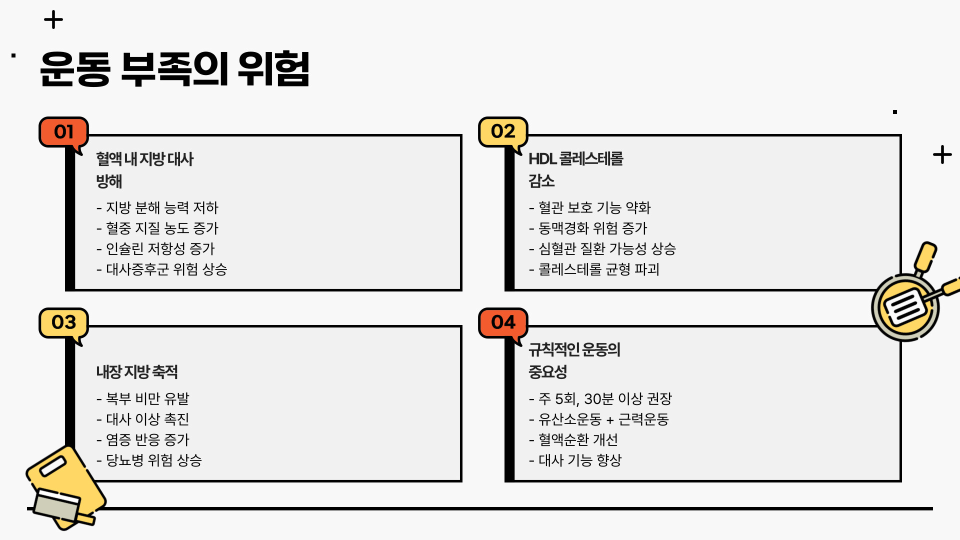 - 좋은 콜레스테롤(HDL) 감소: 운동 부족은 HDL 수치를 낮추어 혈관 건강에 부정적인 영향을 미칩니다.