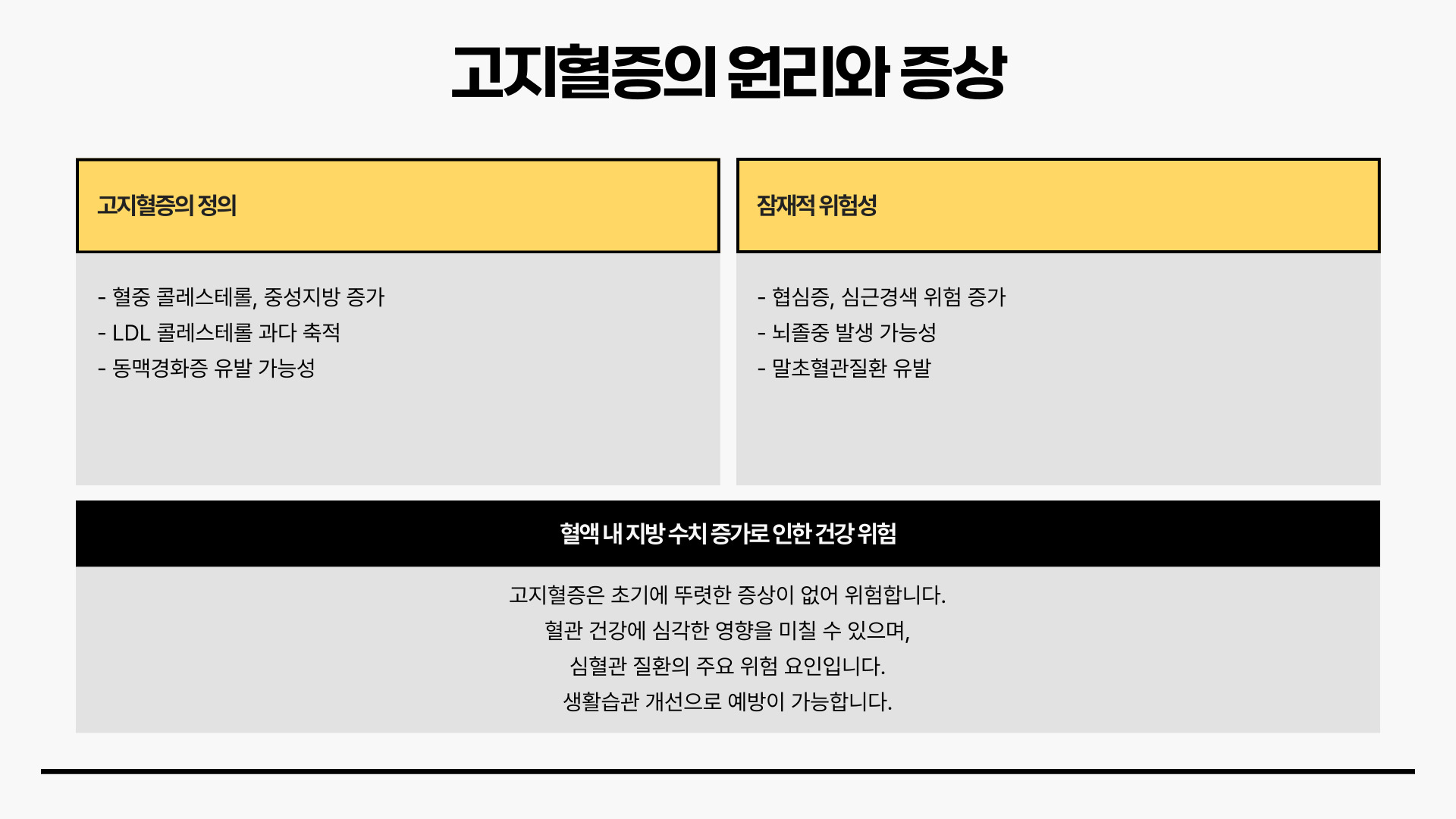 고지혈증은 혈액 내 콜레스테롤과 중성지방 수치가 비정상적으로 높아지는 상태를 말합니다.