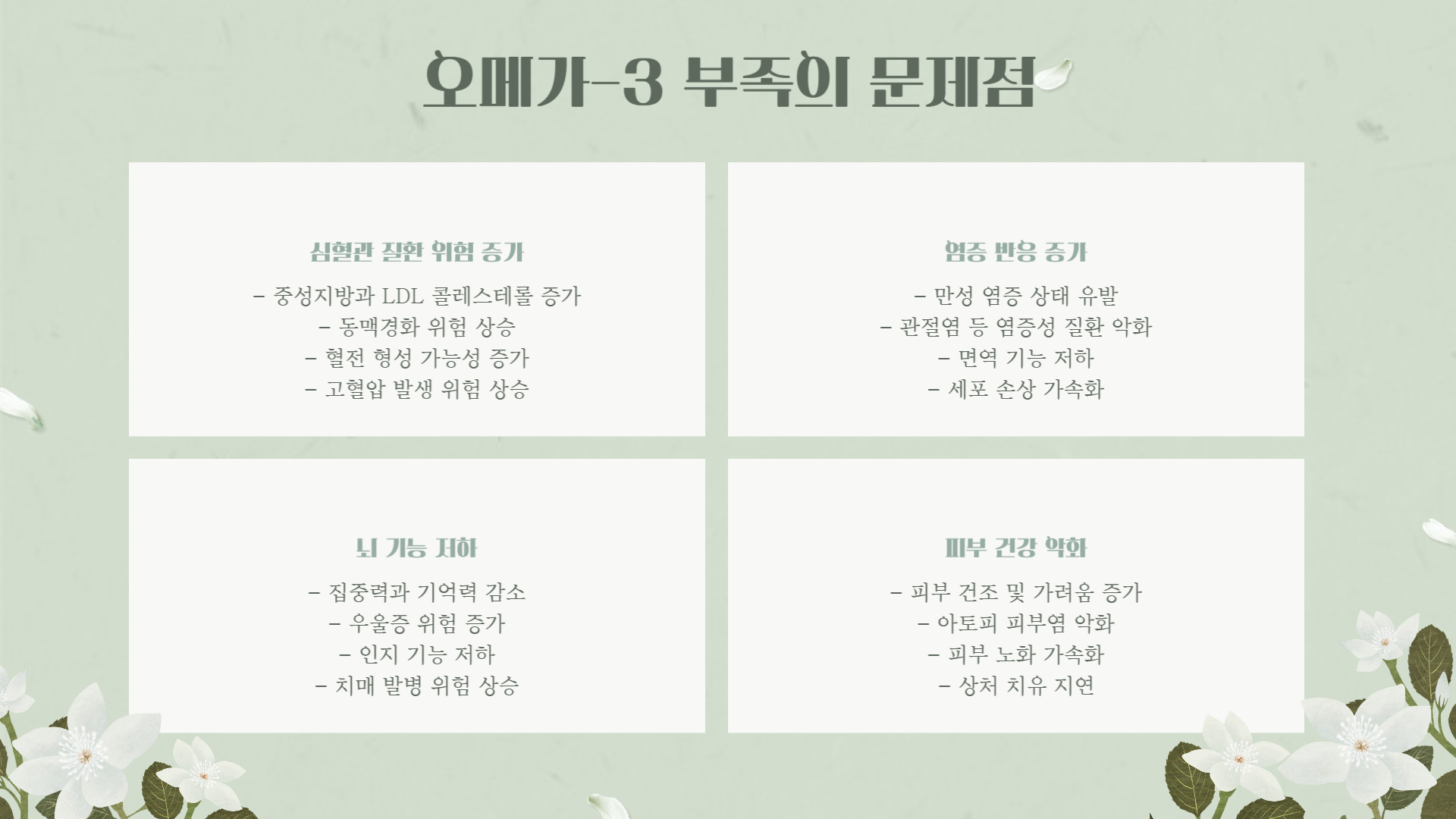 오메가-3가 부족하면 다양한 건강 문제가 발생할 수 있습니다: