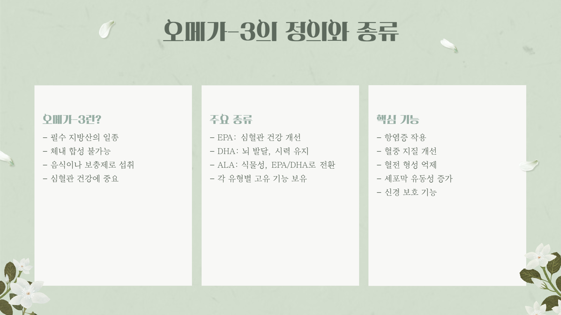 오메가-3 지방산은 우리 몸에 꼭 필요한 필수 지방산으로, 체내에서 합성되지 않기 때문에