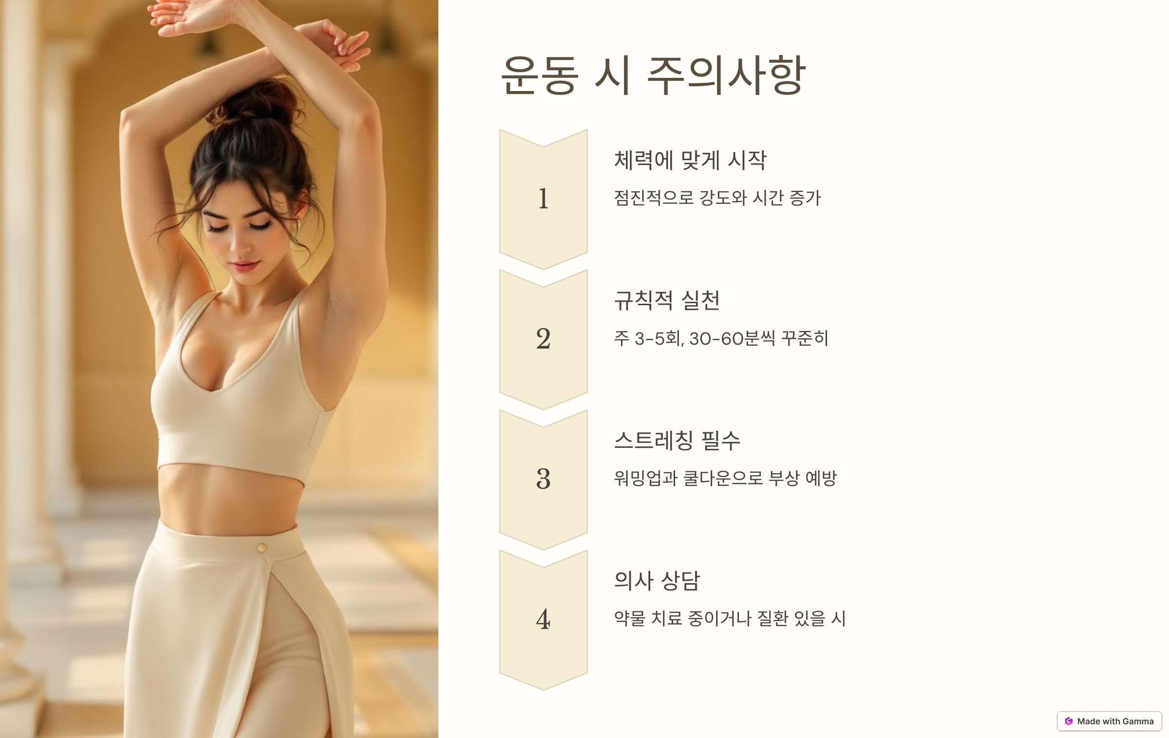 - 처음부터 무리하지 말고, 점진적으로 강도와 시간을 늘리세요.