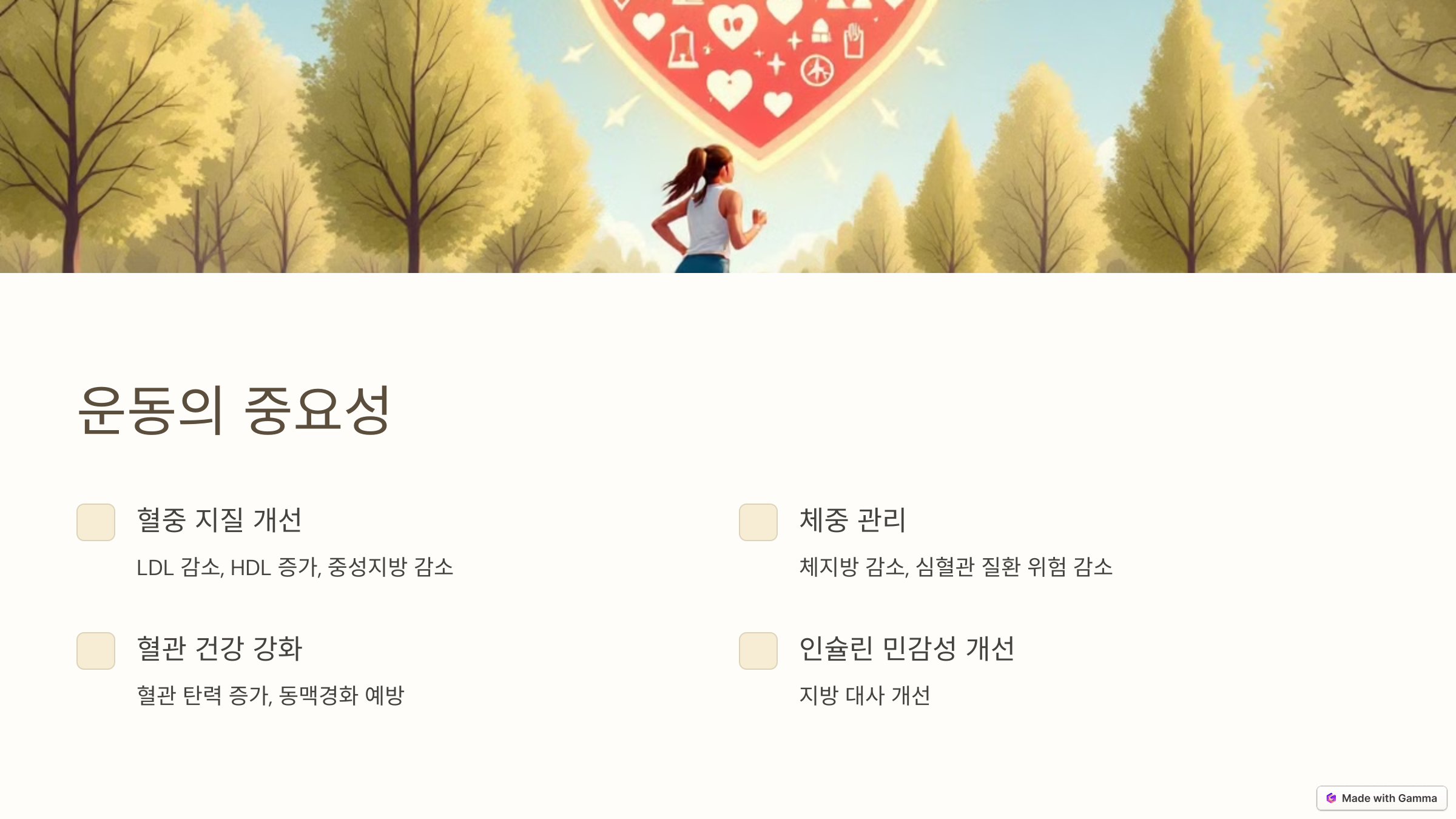 - 운동은 체지방을 줄이고, 심혈관 질환 위험을 감소시킵니다.
