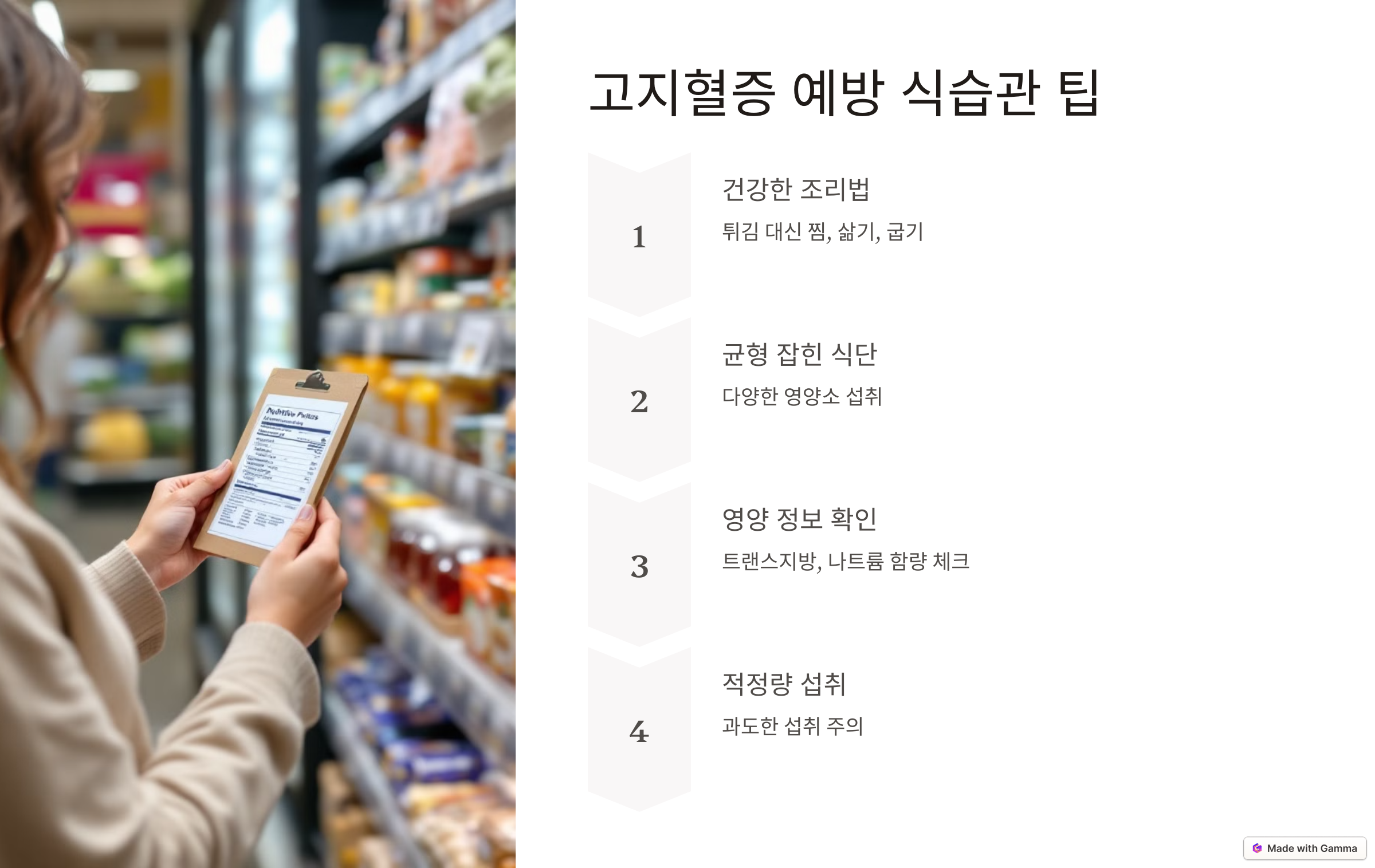 - 제품의 영양 정보를 확인하고, 트랜스지방과 나트륨 함량이 낮은 음식을 선택하세요.