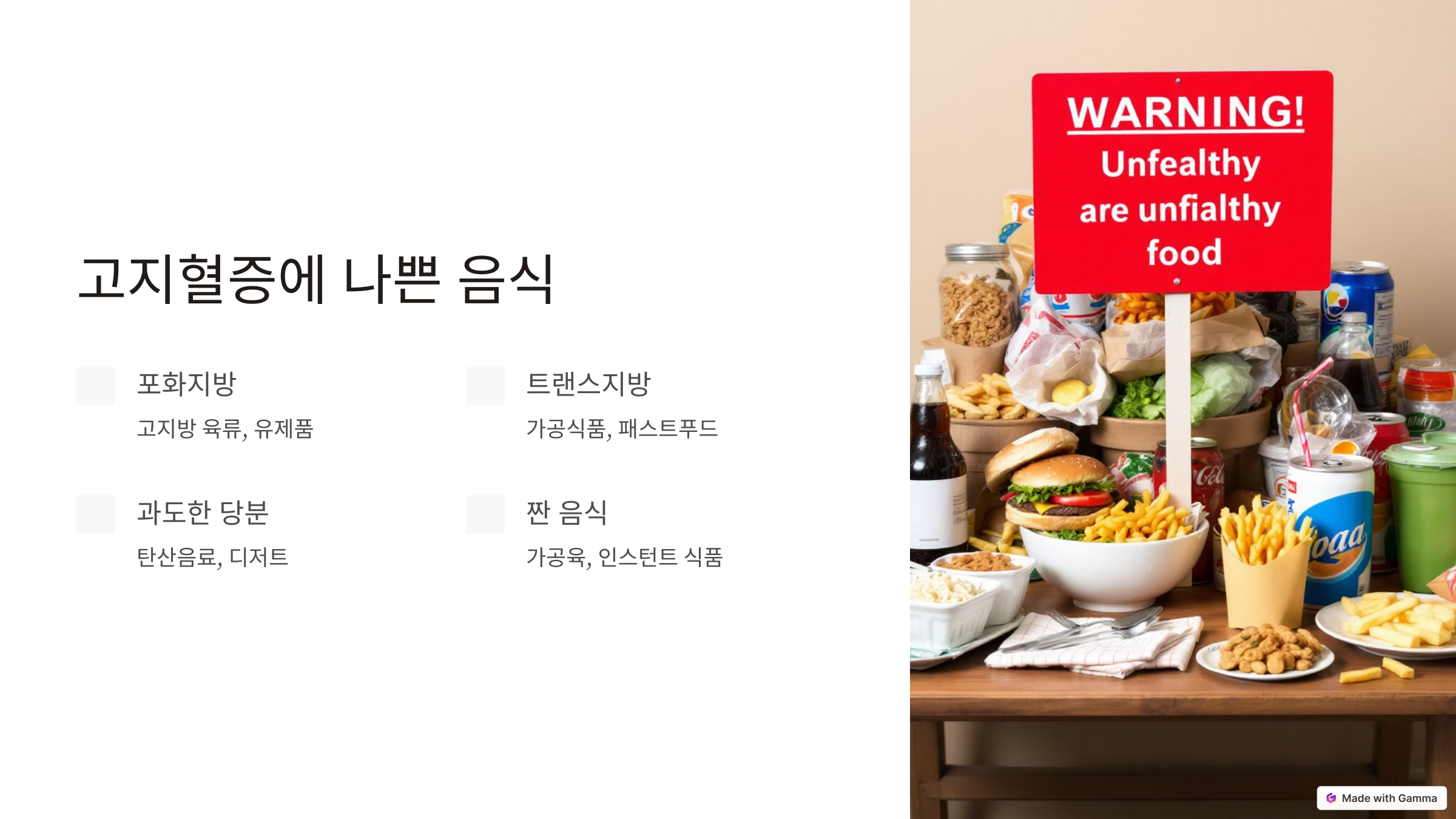 - 패스트푸드(튀김류, 피자, 햄버거)