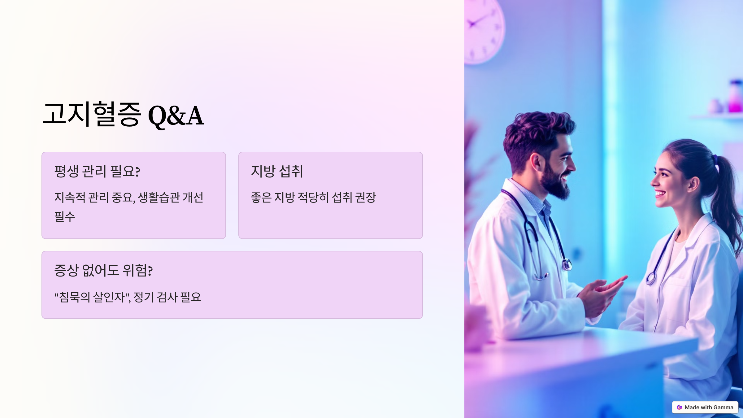 A4: 고지혈증은 초기 증상이 없을 수 있어 "침묵의 살인자"로 불립니다. 증상이 없어도 정기적인 검사가 필요합니다.