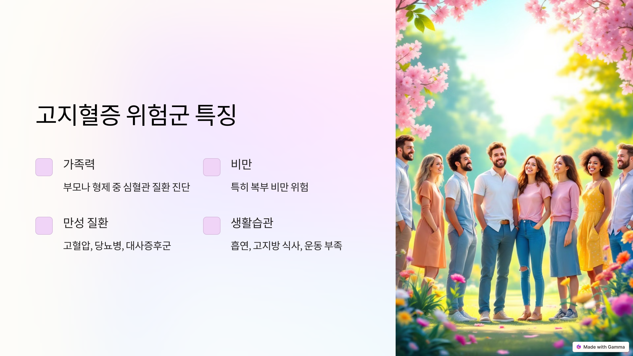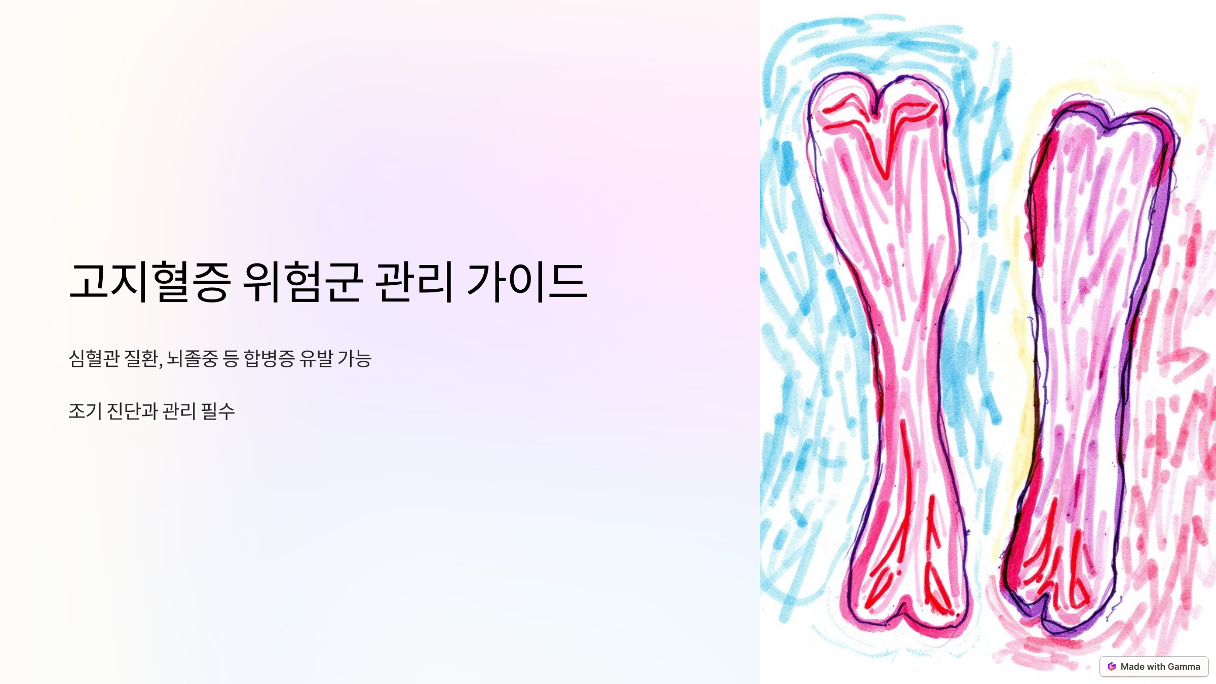 고지혈증은 증상이 뚜렷하지 않아 방치되기 쉽지만, 심혈관 질환, 뇌졸중 등 치명적인 합병증을 유발할 수 있는 질환입니다. 특히, 위험군에 속하는 사람들은 조기 진단과 관리가 필수적입니다.