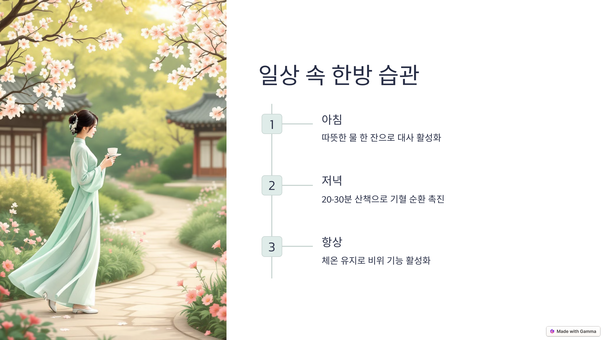 - 저녁 산책: 하루 20~30분 산책으로 기혈 순환을 돕습니다.