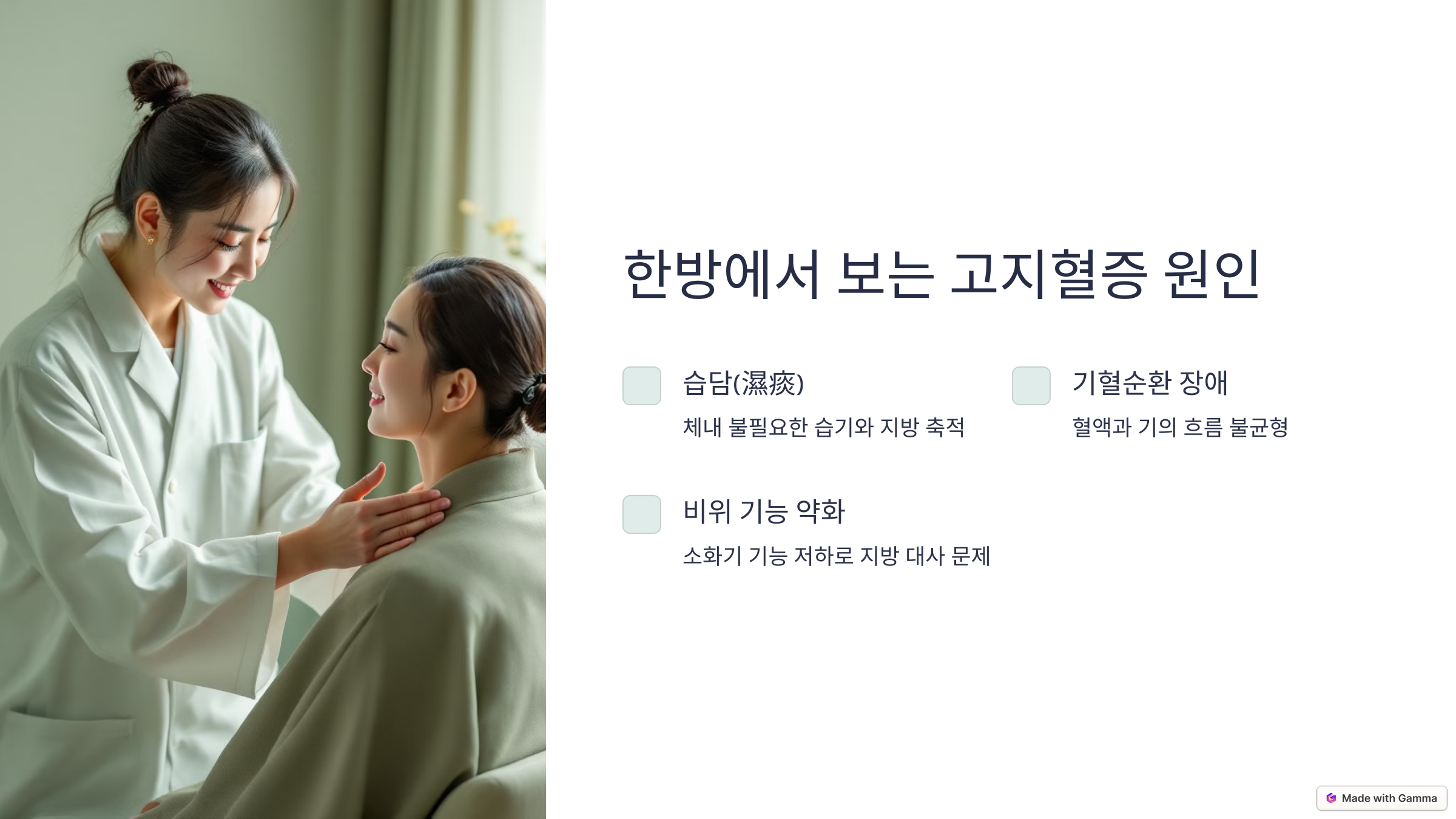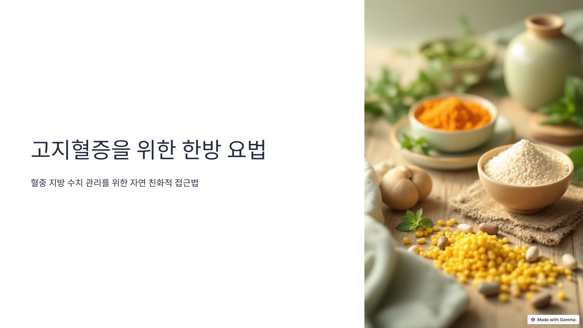 한방 요법은 체질에 맞는 접근으로 근본적인 문제를 해결하고, 혈중 지방 수치를 낮추는 데 도움을 줍니다.