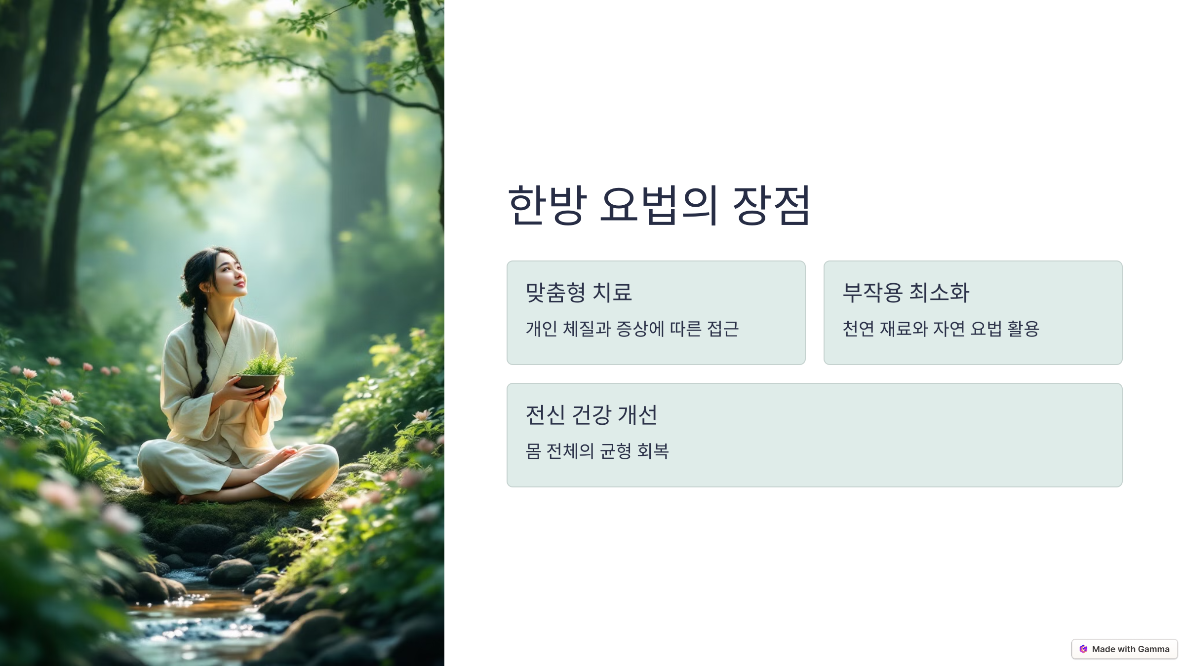 - 한방은 개인의 체질과 증상에 따라 맞춤형 치료가 가능합니다.