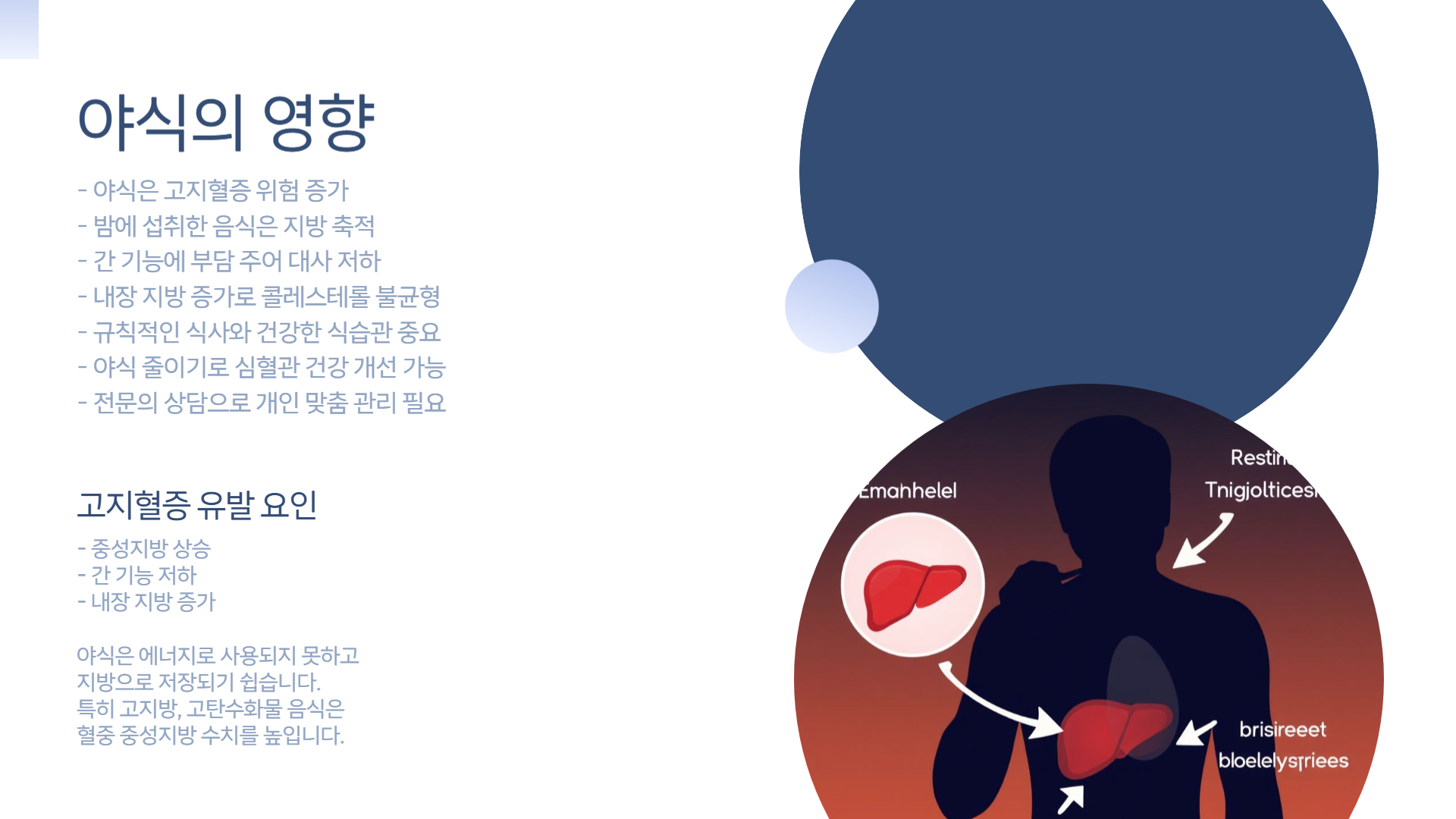 - 야식은 간에 부담을 주어 콜레스테롤 대사에 부정적인 영향을 미칩니다.