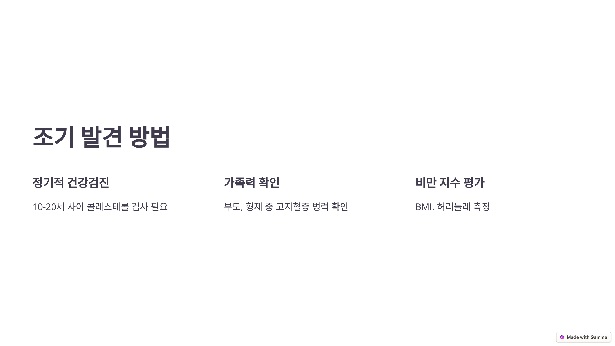 - 부모나 형제 중 고지혈증, 심혈관 질환 병력이 있다면 조기에 검사를 시작하세요.