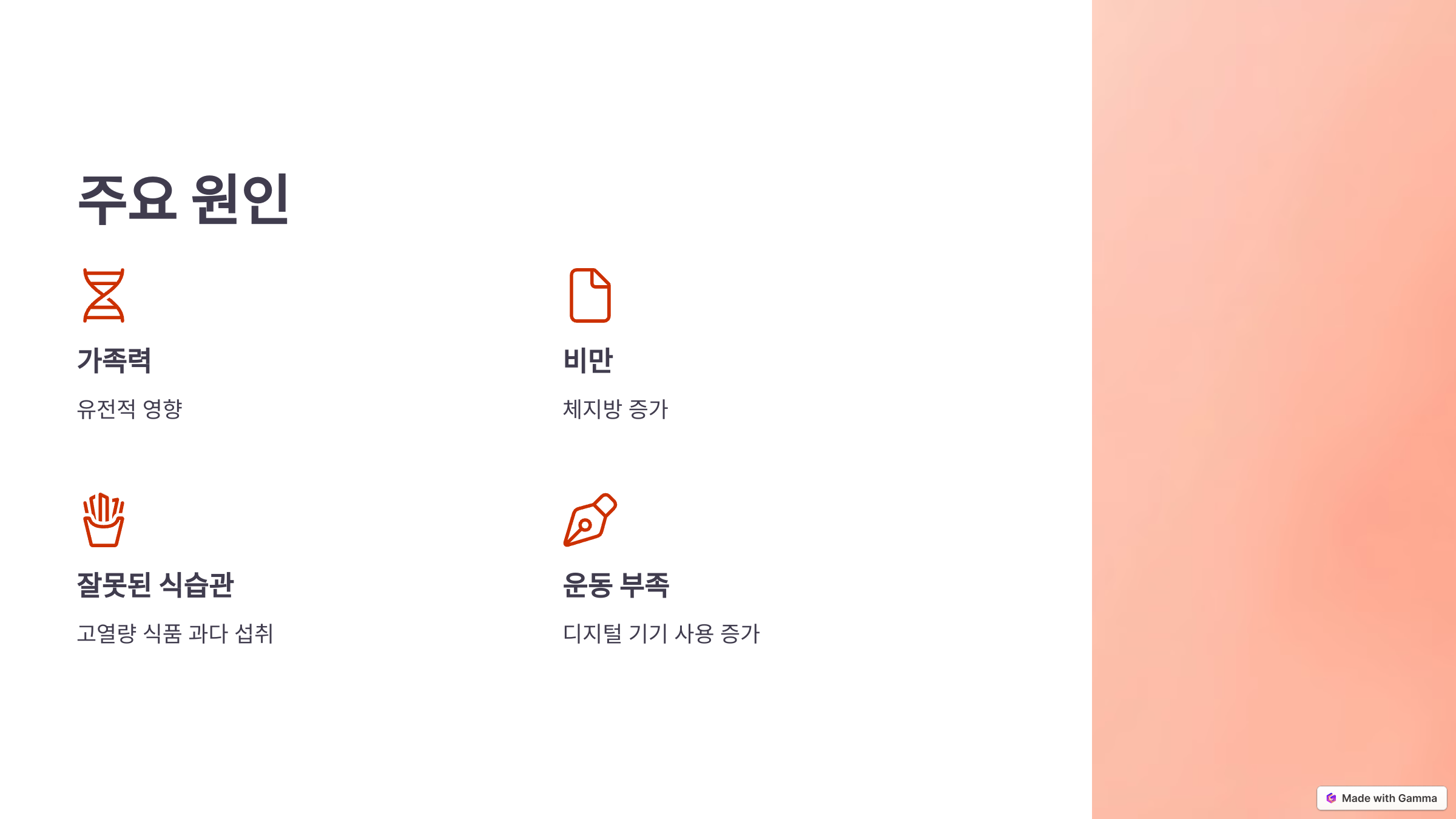 - 잘못된 식습관: 가공식품, 패스트푸드, 고열량 식품의 과다 섭취